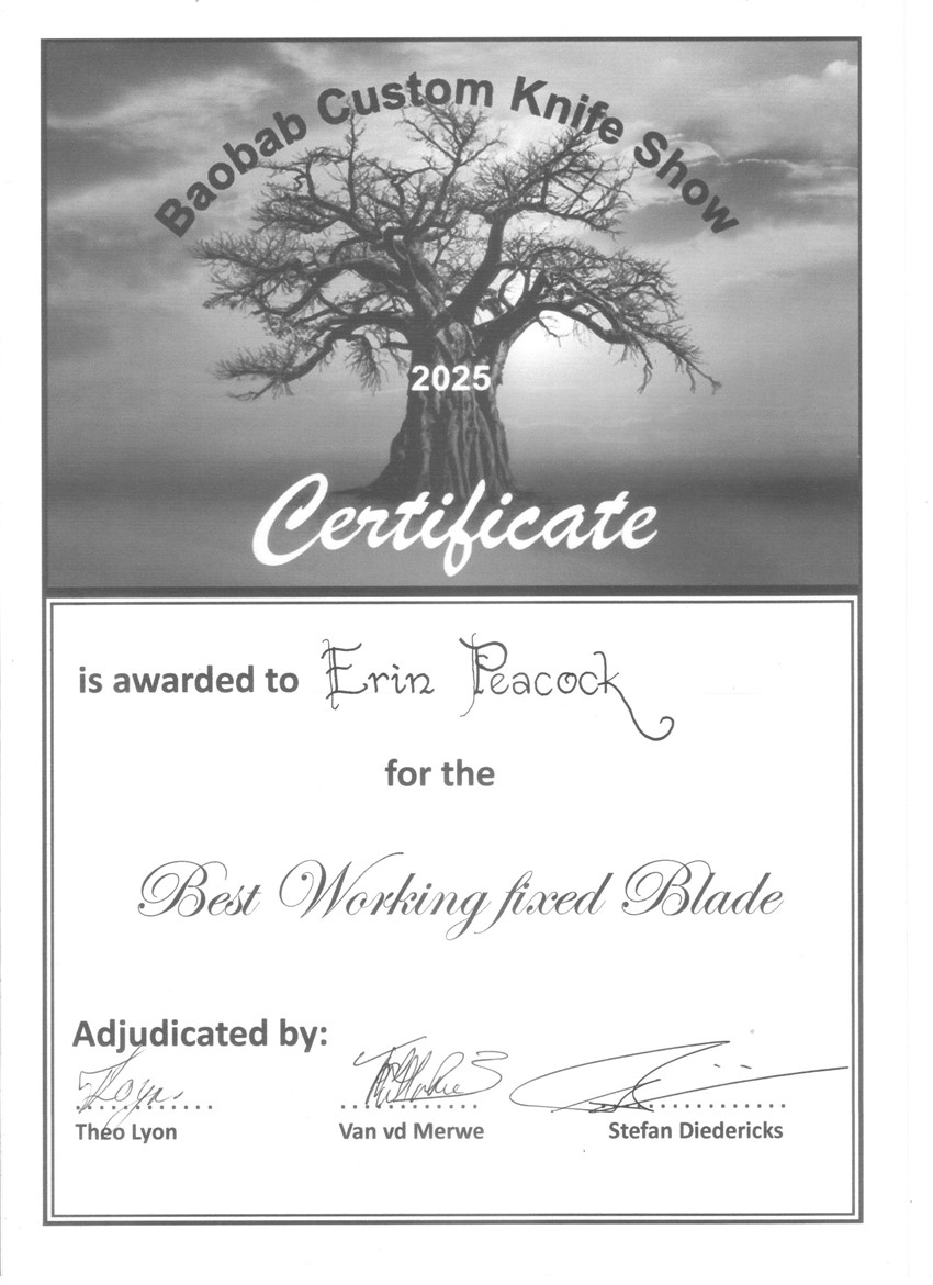 X: @ewpknives ………………………Instagram: @ewpknives……………………….Facebook: EwP Knives………………………..e-Mail: erin@ewpknives.co.za